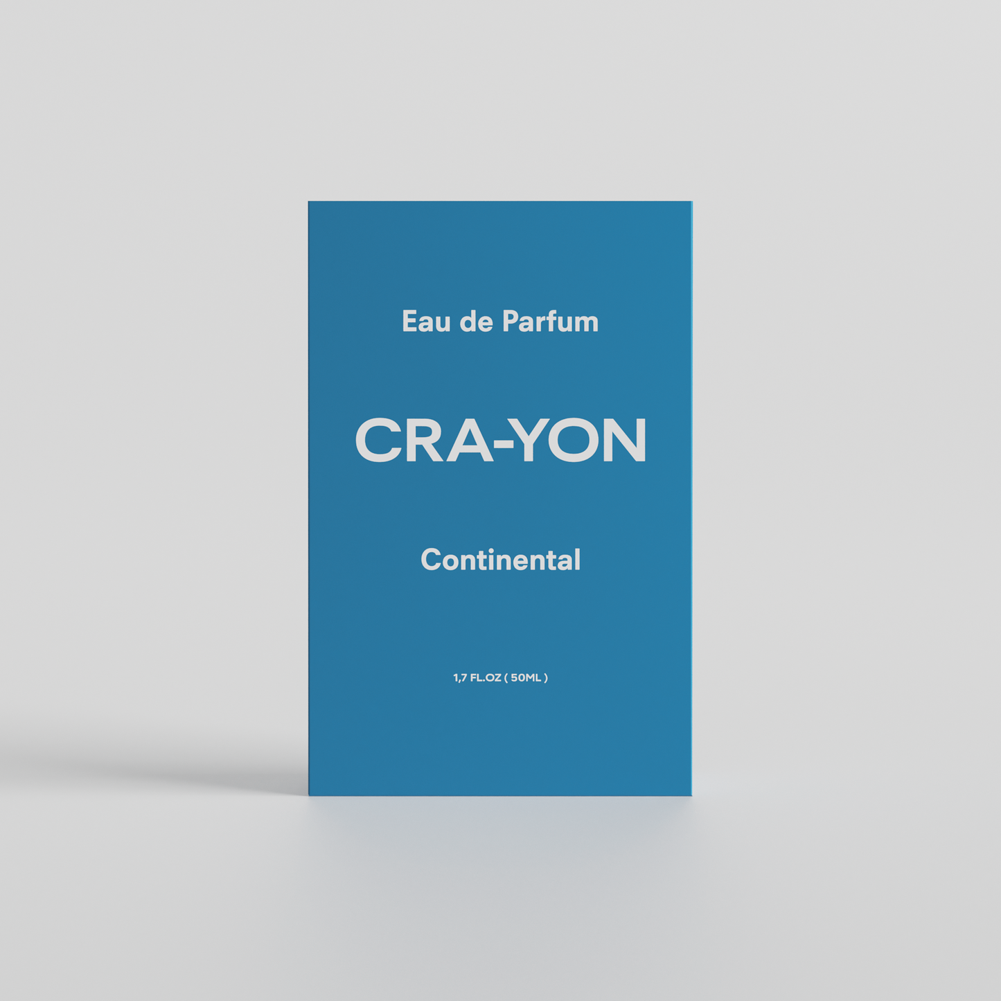 CRA-YON 'Continental' Eau de Parfum box in bold blue packaging, standing on white background
