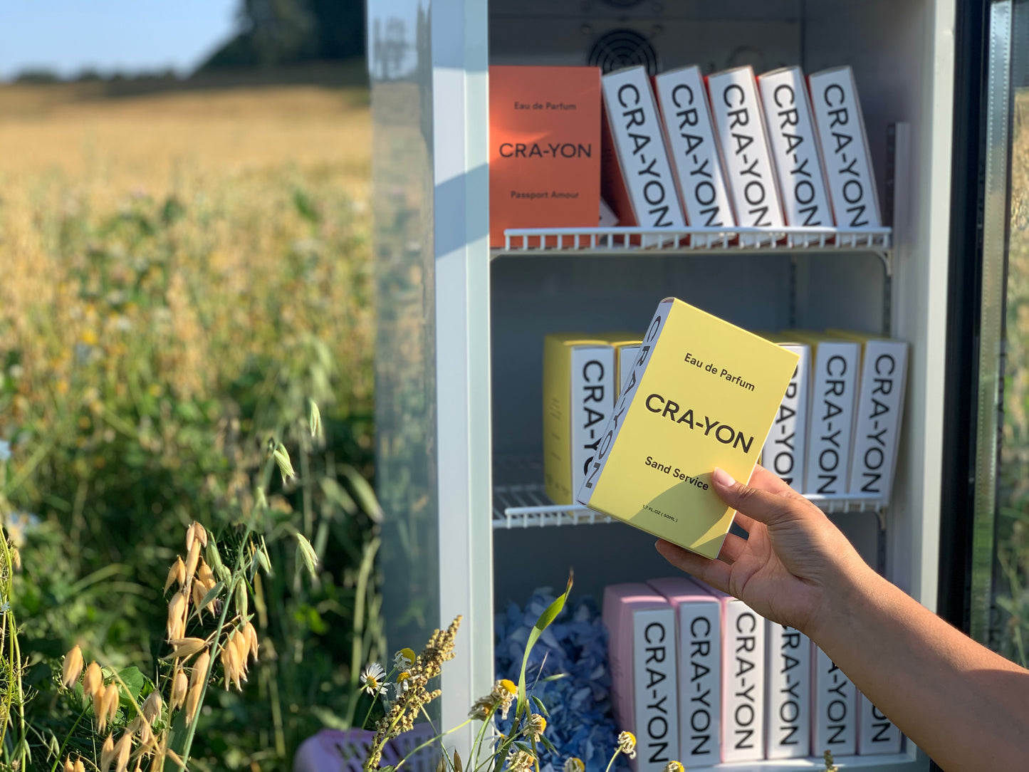 Hand holding CRA-YON 'Sand Service' perfume box in front of an open outdoor fridge filled with CRA-YON fragrances in a field