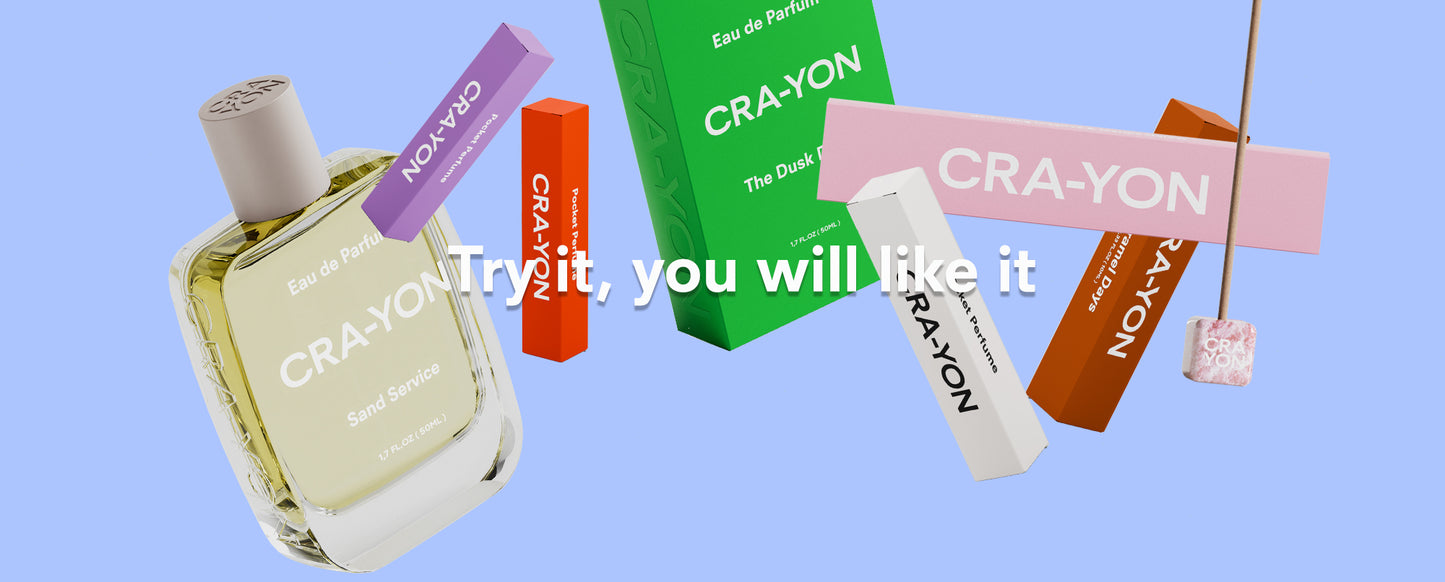 CRA-YON Sand Service – pocket perfume and light yellow box standing on a light background