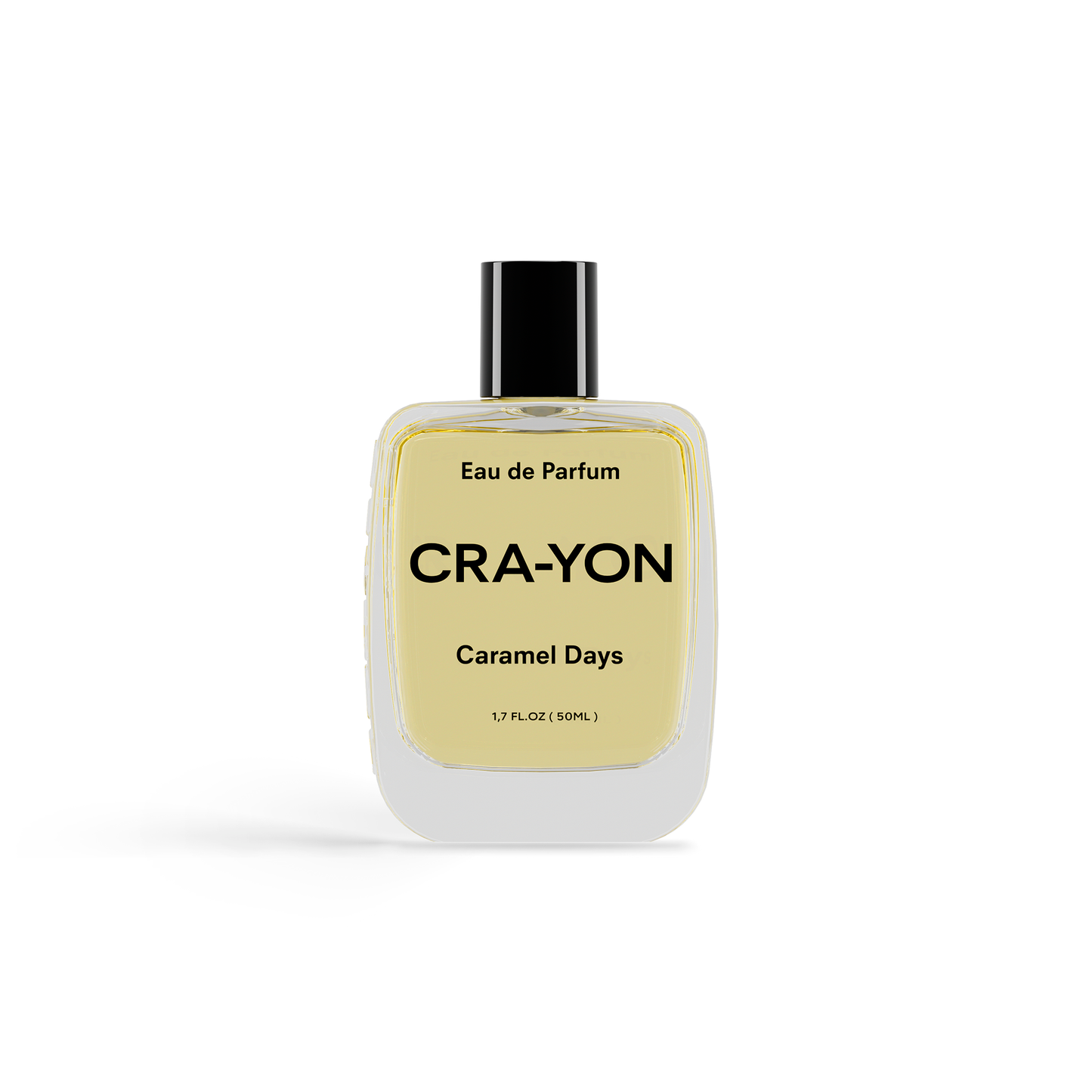 CRA-YON 'Caramel Days' Eau de Parfum bottle with beige cap and yellow fragrance, standing on white background