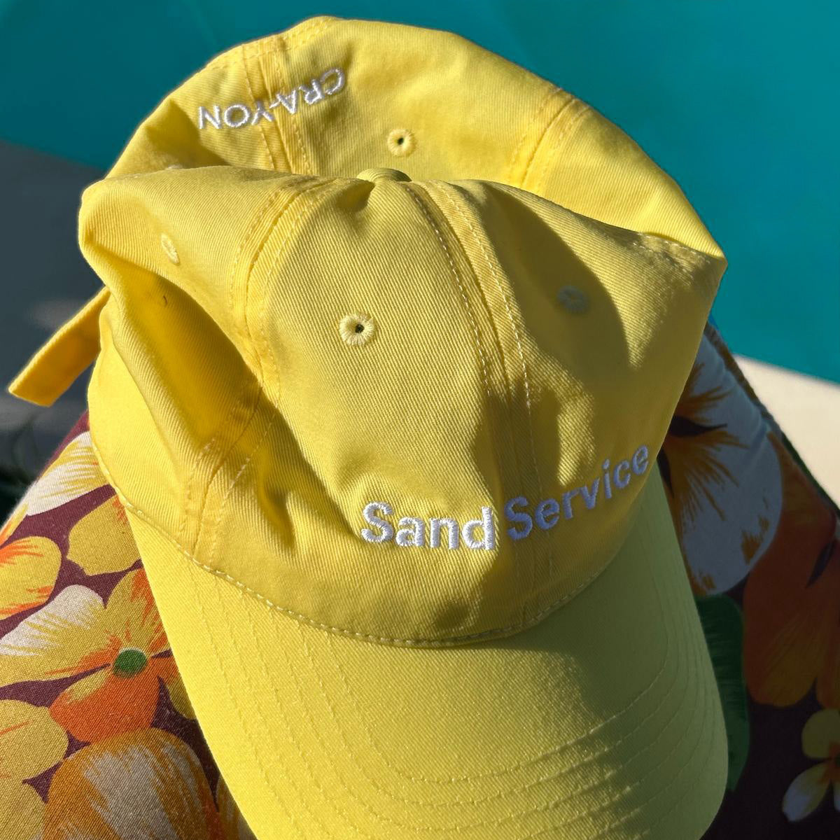 Yellow cotton cap with white embroidered “Sand Service” and “CRA-YON” logos, placed poolside.